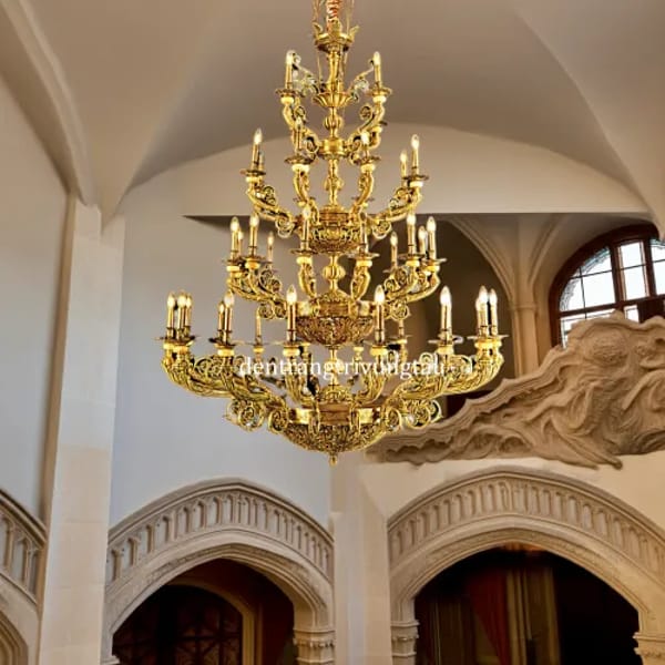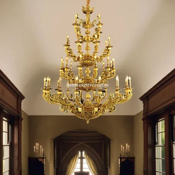 Đèn chùm đồng cổ điển cao cấp, được chế tác hoàn toàn thủ công từ chất liệu đồng nguyên khối bền đẹp, mang những đường nét hoa văn tinh xảo và sang trọng. Sản phẩm có màu vàng đồng ánh kim sang trọng, kích thước: đương kính tròn 150cm x H190cm, phù hợp để làm điểm nhấn nổi bật cho phòng khách, sảnh lớn hay nhà hàng cao cấp. Đèn không chỉ tạo nên không gian ấm cúng, đẳng cấp mà còn phản chiếu ánh sáng lung linh, tạo nên sự cuốn hút và nâng tầm phong cách sống cho gia chủ. Đuôi đèn E14